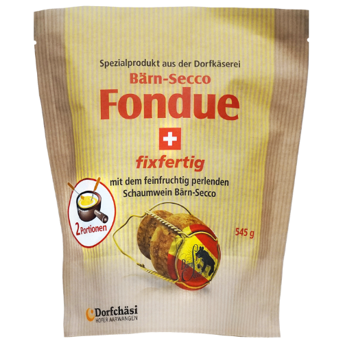 Ein richtiger Knaller nicht nur an Silvester! Das Fondue Bärn-Secco wird aus Aarwanger Aarechäs und Mammutkäse sowie dem Schaumwein Bärn-Secco hergestellt. Dieser unterstützt den Fonduegschmack mit seiner leichten Art und seiner dezenten Fruchtigkeit. Der ergänzende Cognac verleiht dem eleganten Schmaus zudem eine abgerundete Note.